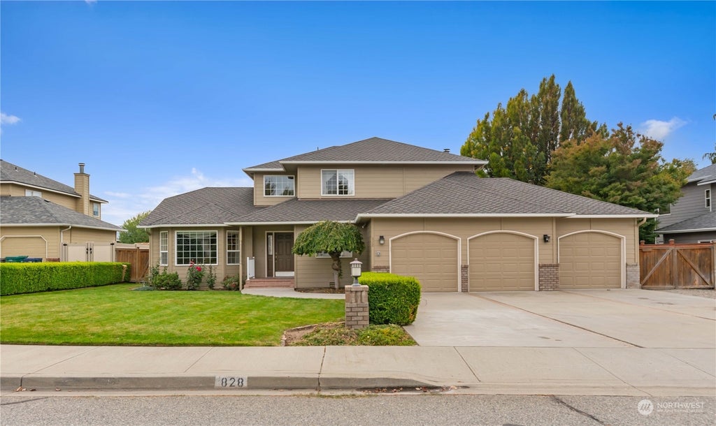 Traditional, gracious two story at the end of a pretty culdesac only blocks from Eastmont Junior High. Beautiful, mature landscaping includes perennials and shade trees all irrigated with irrigation water. Full quality exterior paint completed 9/2024 with siding replacement as needed. Spacious deck to the south with an electric sun shade for summer enjoyment in fully fenced backyard with garden shed. Three full garage door garage has built in quality storage and a bay with a cabinet unit that can be removed or stay. Main level office with built ins. Kitchen full of custom cabinetry and a wall of pull out drawer pantry/storage space. Upper level offers primary, two additional bedrooms, main bath and luxury master bath and closet.