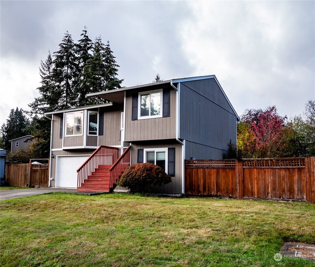 A BETHEL BEAUTY! Open concept living/kitchen combo with vaulted ceilings! Laminate hardwoods dominate the upper area that has super cool custom built in entertainment center and the 60 inch TV stays too. Opens to lovely kitchen with HUGE island, stainless appliances and added removable pantry. Upstairs also includes the primary bedroom and attached bath with a toilet seat you'll be thankful for in December. Downstairs you'll find the rec area plus bedroom and full bath as well. Head outside to the amazing covered patio and fully fenced back yard that overlooks the community greenspace. No neighbors looking through your windows. Plenty of room to garden or sun yourself. All appliances stay (including W/D). Close to schools and shopping.