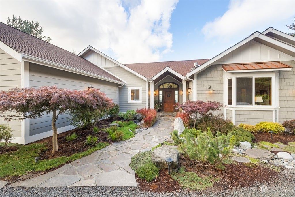 Luxury Bell Hill Estate. Breathtaking views of Sequim Bay, Happy Valley & the Olympic Mountains, Private 2.5-ac lightly treed, low-maintenance landscaping. Inside, enjoy soaring cathedral ceilings, solid wood doors, & rich wood floors. The spacious great room features a gas fireplace with stately mantle. The recently remodeled kitchen is equipped with a Thermador 5-burner gas range, double ovens, quartz counters & a walk-in pantry. The primary suite offers vaulted ceilings & a spa-like en-suite with heated tile floors, a custom shower & a jetted tub. Guest suite features a gas fireplace. No steps from the garage, circle drive & heated flex room add versatility. Just 10 mins to downtown Sequim dining & medical & The Olympic Discovery Trail.