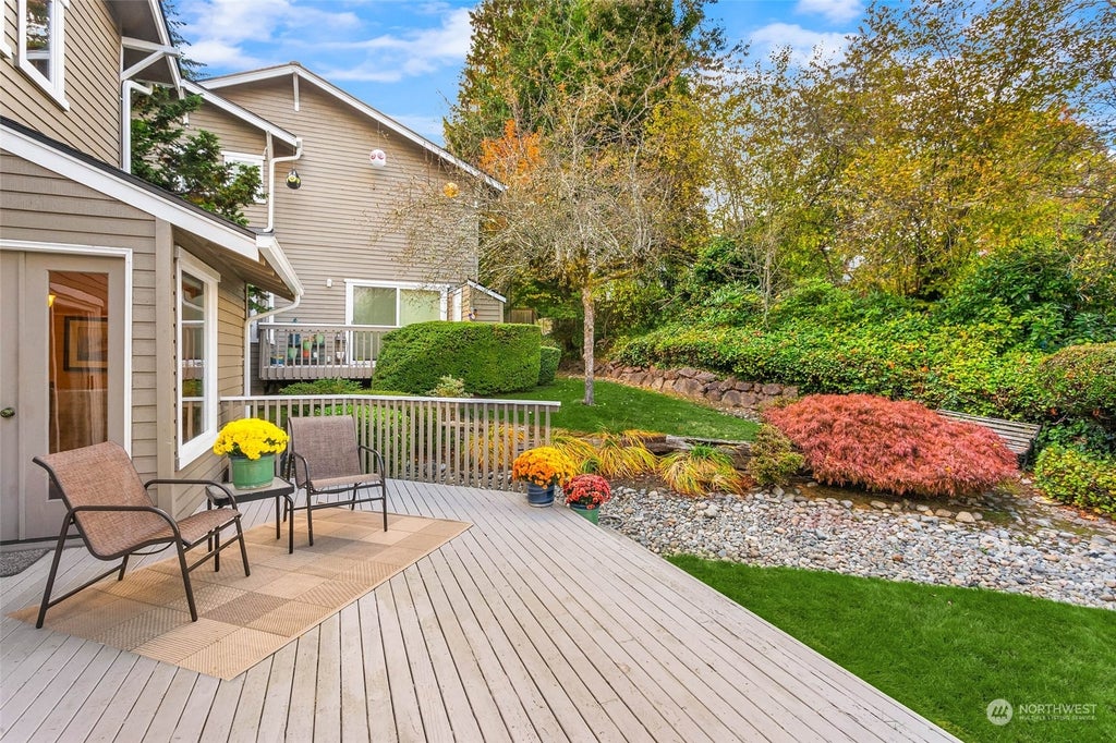 It's all about the location Lovely townhouse in the boutique Regents Park Townhomes, feels like a single-family home. 2 bedrooms, 2.5 baths. Main floor living area features wood-burning fireplace in great room with a big slider to an expansive deck overlooking a lush grarden/yard area that you don't have to take care of! French doors off the dining area access the deck, too, along with an exterior storage closet. Newer kitchen cabinets, appliances, solid surface counters, & cool slide-out pantry. Primary suite has views of the Bellevue skyline, a walk-in closet, and private bath. Second bedroom large enough for office & guest room. Updates include no popcorn ceilings and mini splits for heat/cooling. So close to shopping, dining, and parks.