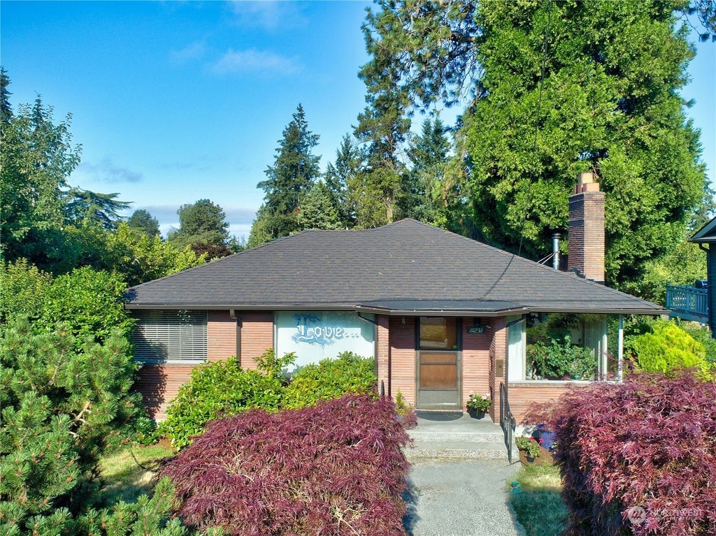 Gorgeous Mid Century Modern with wonderful curb appeal & beautiful mature landscaping, on large private lot. The morning sun drenches the living room that features refinished hardwood floors & elegant flat stone fireplace. Classic retro kitchen with abundance of cabinet, counter space & stainless steel appliances. Spacious lower level boasts a spacious kitchenette, family room with fireplace or 4th bedroom & closet, additional bedroom, & bath, & expansive utility/laundry room. Ideal MIL for extended family. High hedges make for private backyard with one car driveway to garage off alley. Lovely tiled patio off main kitchen is ideal for summer hosting. New roof & updated plumbing. Large lot makes it potentially feasible for a DADU & garage.