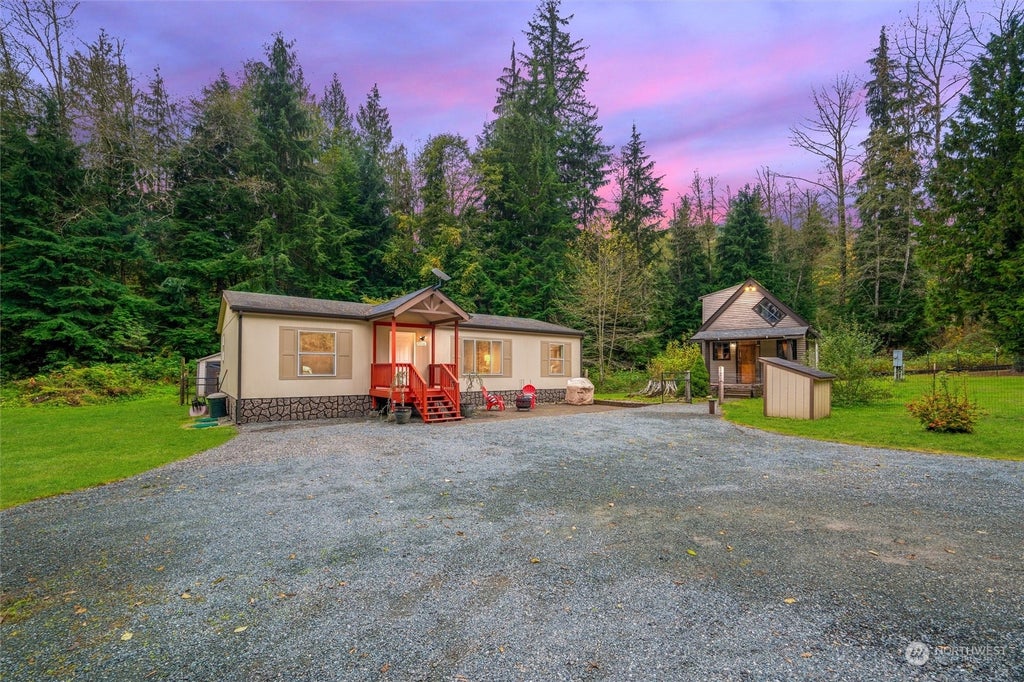 Discover your own slice of paradise with this affordable, move-in ready property on 5 acres! This charming 3-bedroom, 2-bathroom home offers the perfect blend of comfort and convenience, featuring a rustic bunkhouse cabin complete with a kitchenette and bathroom—ideal for guests or as a cozy retreat. The home's floor plan features a split layout with the living space at the heart of the home. Located just minutes from I-5, you’ll enjoy easy access to both Bellingham and Burlington, while being steps away from Blanchard Mountain trails and endless outdoor recreation. Surrounded by towering evergreens, this private haven provides ample room to relax, explore, and make it your own. Don’t miss this unique opportunity for acreage living!