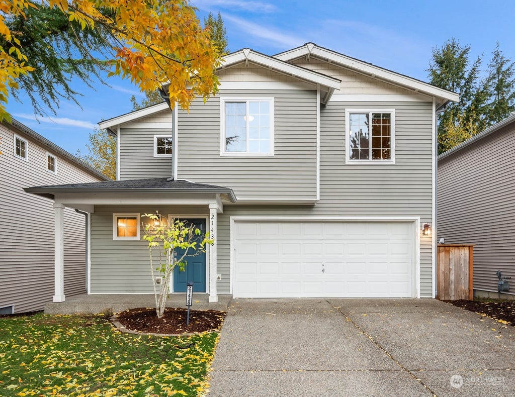 This spacious property boasts a diverse floor plan, featuring a two-story layout plus a daylight basement. Relax on the charming front porch, entertain in the open living room and kitchen area with a large island. Step onto the deck for picturesque views of the fenced backyard. The basement serves as a fully functioning ADU apartment with a kitchen, laundry, and bath—ideal for rental income or multi-generational living. New carpet throughout, fully staged. Prime location with neighborhood amenities, including a park and basketball court. Near Lake Sawyer, offering endless opportunities for outdoor recreation.