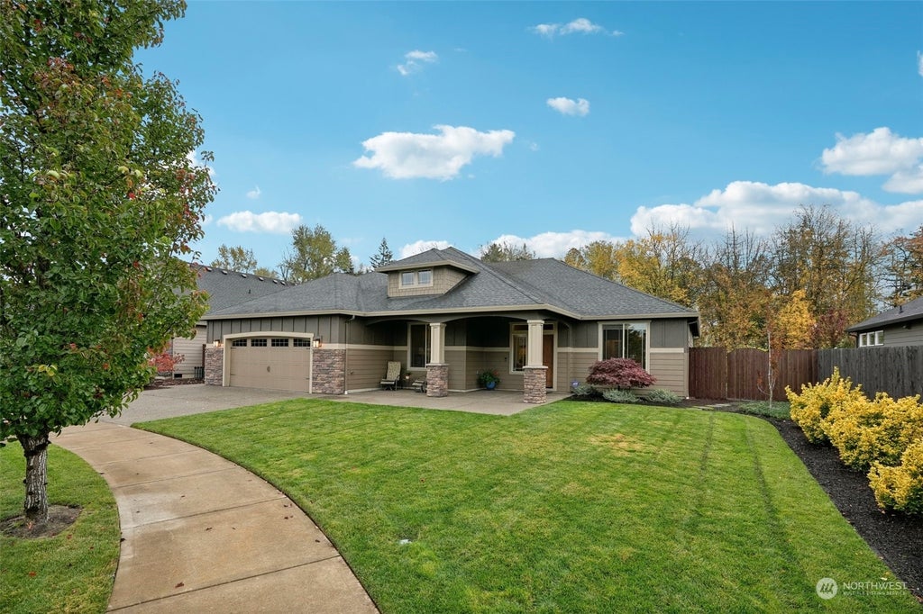 SERENITY AWAITS! Enjoy all the features of this wonderful Fieldstone Estates home. Great Room floorplan, high ceilings & arched doorways make this home very warm & inviting. Great Room boasts wood floors, cozy fireplace, built-ins & oversized windows w/view of the backyard & trees beyond. Light & Bright 3BD+Den & 2 Full BA enclosed in 2577+/-sqft. Owners Suite is oversized with large bath, soaking tub, tiled Shower & HUGE, customized, WI-Closet. Entertainers' Kitchen with SS appliances, Built-in Oven & Microwave, 6-burner gas cooktop, Island, WI-Pantry & eating nook. Bedrooms & Den/Office with W2W Carpet & Large windows. Out back you will find a covered patio & EZ care manicured yard with a sprinkler system & raised bed.
