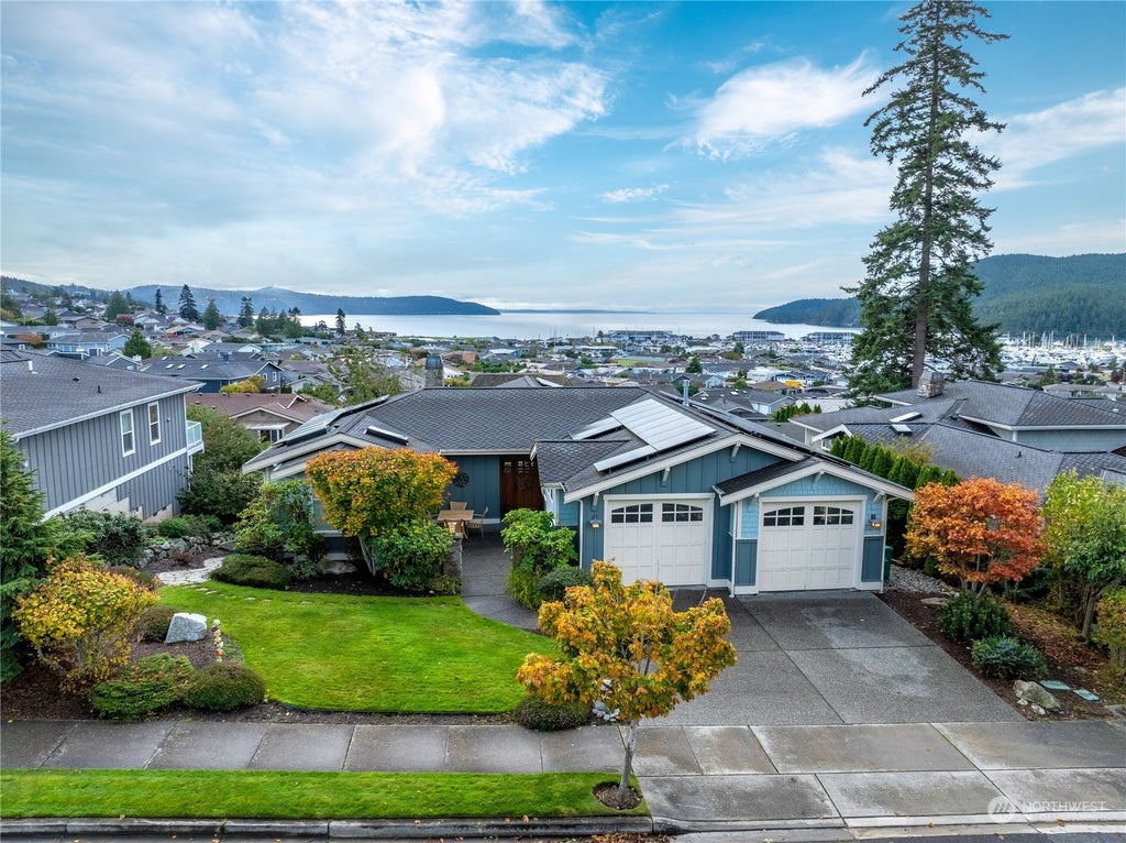 This beautifully appointed home offers breathtaking views of Burrows Bay and the surrounding San Juan Islands. A courtyard entry welcomes you inside to the great room featuring a floor plan that seamlessly flows between living, dining and the gourmet kitchen with deck access; all main level living. Owner's suite boasts a private deck ideal for relaxing and soaking in stunning sunsets, along with double closets and a luxurious king-sized bath. The lower level offers two generous bedrooms, a stylish 3/4 bath with travertine floors, and a large recreation space perfect for game nights & hobbies. The yard is fully landscaped with a tranquil water feature, slate patio, and charming garden shed. Garage is EV charger ready; Solar.