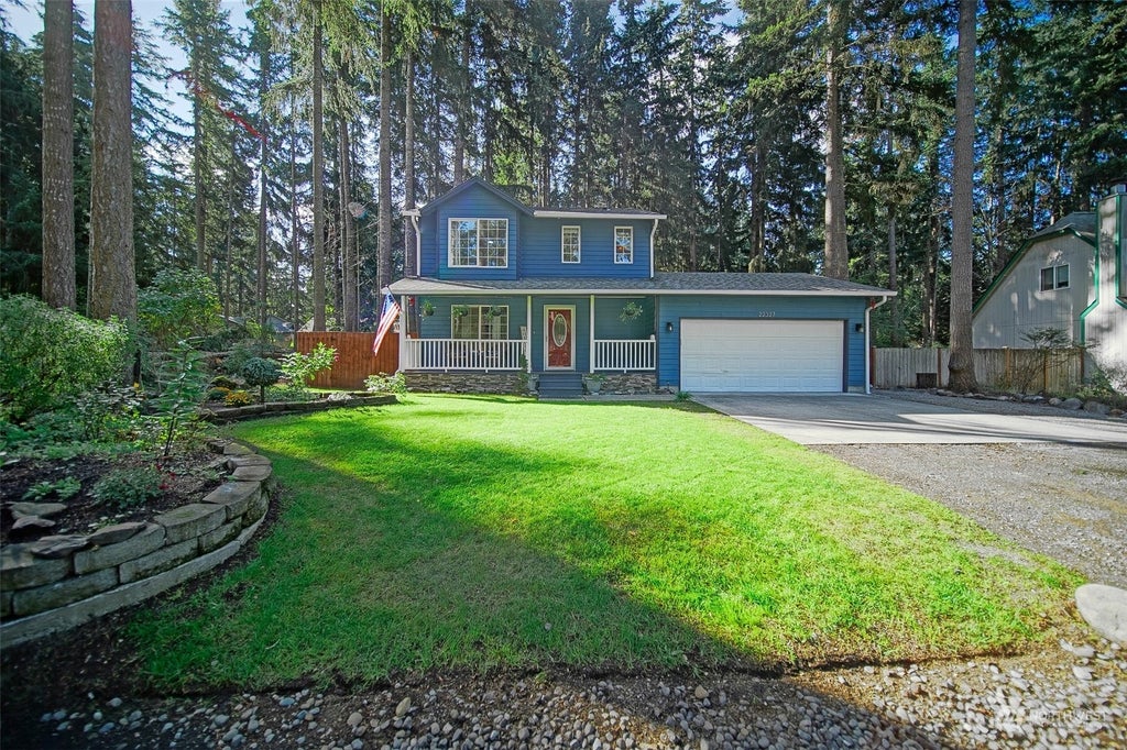 Craftsman w/ .19 acre lot. Front yard w/lawns & terraced gardens. 2 car garage w/ storage racks. Gravel side yard, for RV. Back yard fully fenced w/big lawn, water feature, outbuilding, fire pit & large elevated deck. Interior w/spacious entry & wall accents throughout. 3 bedrooms up including primary w/ walk in closet. 1.3/4 baths in total. Kitchen w/ pantry, French doors to back deck, butcher block counters, stainless appliances. Pellet stove in living room with beautiful live edge mantle and rock wall accents. Large storage area under stairs. Home has been remodeled inside with new floors throughout. Newer roof. Clearwood features 3 lakes, 6 beaches, 16 miles of walking trails, fishing, playgrounds, sport courts, community pool & more.
