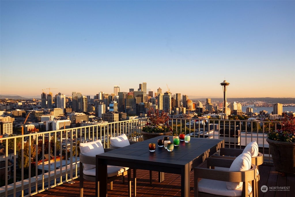 Dramatic views of the Seattle skyline, Space Needle and Puget Sound define this elegant home located on a peaceful, tree-lined street on Queen Anne Hill. Awash with natural light from the floor-to-ceiling windows, the beautifully proportioned dining and living room area is designed for entertaining. A spacious kitchen and family room overlook the Sound and Olympic mountains The roof deck offers dazzling views. Occupying an entire floor, the luxurious primary suite with a gorgeous bathroom, soaking tub, and adjacent office is a perfect refuge. Two additional bedrooms, a full bath and a family room are found on the ground floor which opens onto the terrace and lovely gardens. An elevator services all the floors from the 2-car garage. Superb!