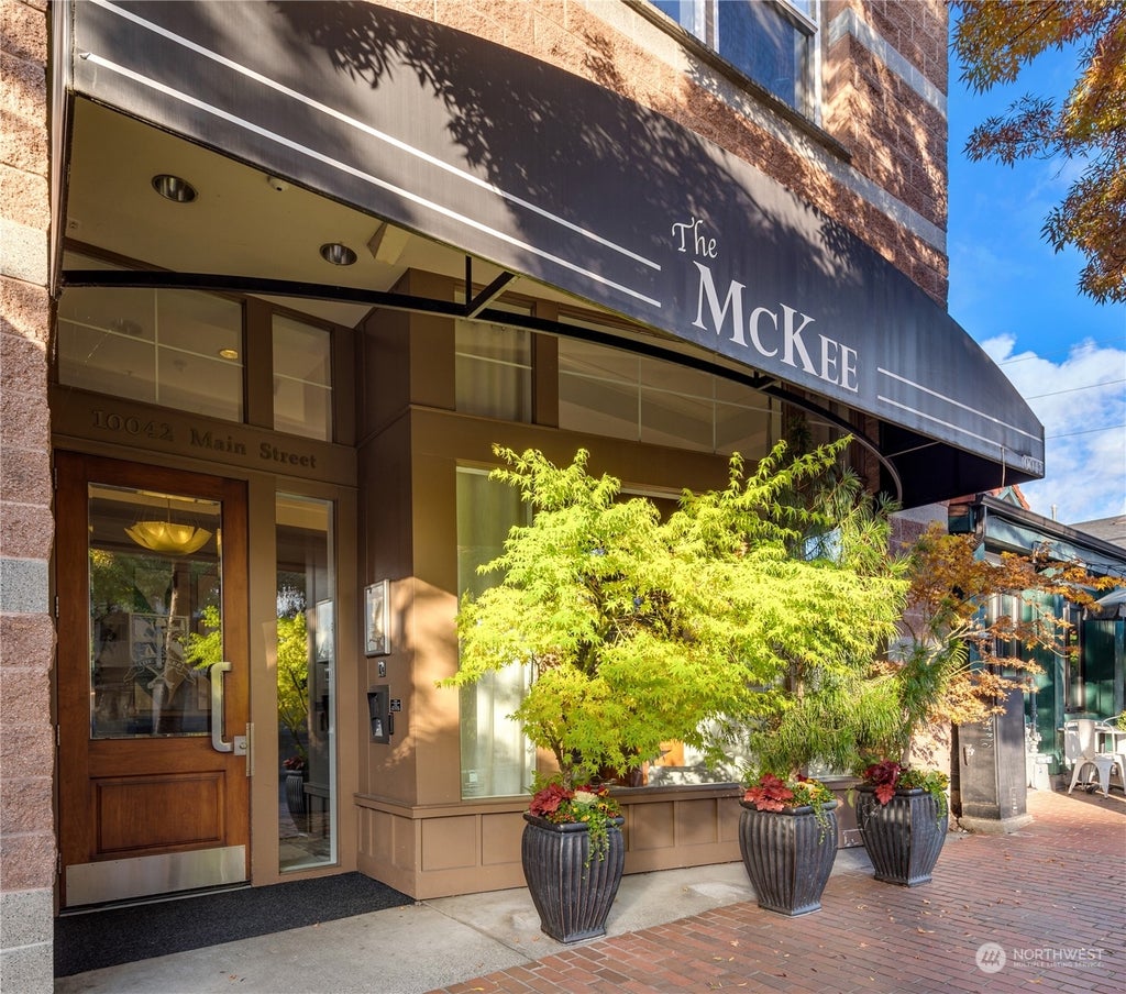 In the heart of Old Bellevue lies The McKee, a condo building fronting Main Street to the south and Downtown Bellevue Park to the north. Unit 204, a corner unit overlooking Main Street with a slight water view to the west, is a home filled with natural light and a wide-open floorplan. The kitchen has been updated, and there is plenty of storage, in-unit washer/dryer, a cozy gas fireplace, 2 covered decks, and 2 parking spaces in the secure garage. The highlight of this home, however, is the largest-in-the-building private patio that will knock your socks off. This patio is something one rarely sees in a condo building and it is fantastic! The McKee allows 2 furry friends, no cap on rentals, and even a guest suite to reserve. Pre-inspected.