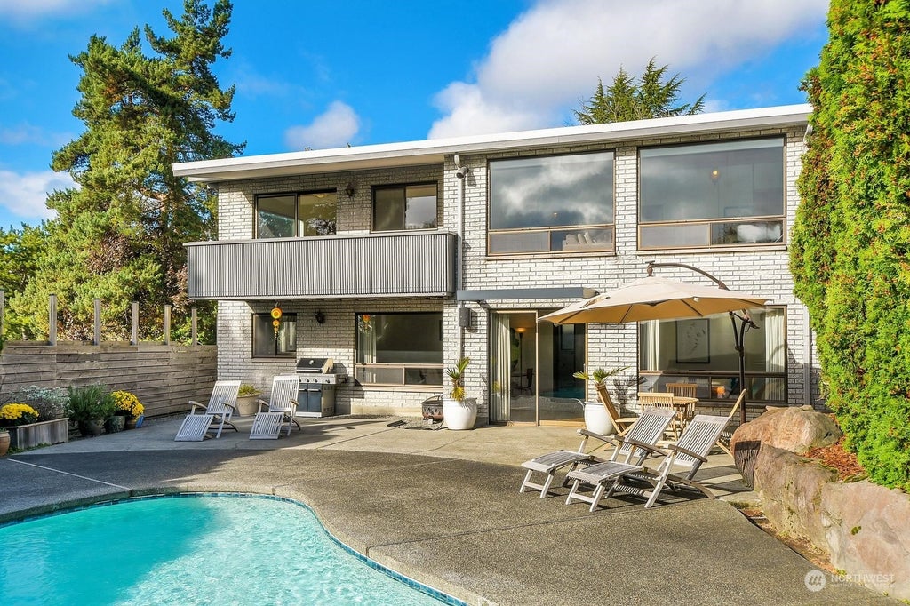 Classic, remarkably attractive & spacious mid-century home! Main level boasts elegant vaulted ceilings w/ exposed beam & lovely oak flrs. The living rm presents an impressive flr to ceiling stone fireplace. Grand lower level has 2nd stone fireplace & 2nd kitchen. Over-sized windows bathe this home in natural light. Park-like fully fenced grounds offer exceptional privacy. Separate garden area. Beautiful in-ground swimming pool. Air Conditioning! Spacious 1-car garage & 4 off street parking spots. Metal roof w/ solar system provides much of the energy demand. Unobstructed view of the Olympic Mtns, city skyline & beautiful sunsets due to proximity of interstate, providing open space for songbirds, eagles. Close to Light Rail & Maple Leaf Park