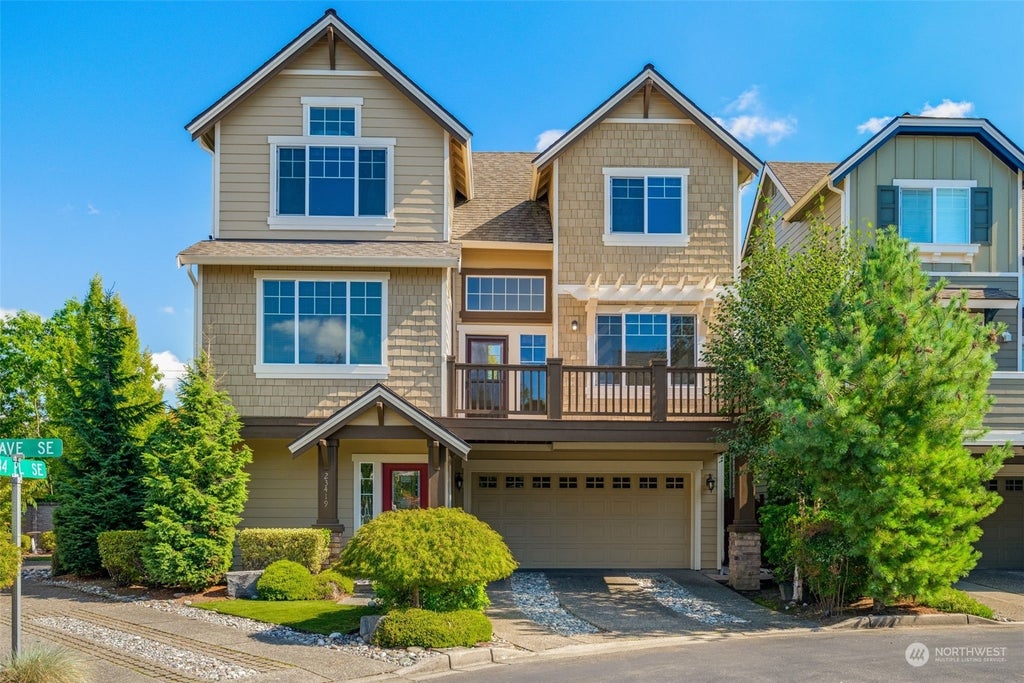 Gated community, centrally located. Abundant Natural Light. Main Floor features open Living room w/gas FP, built-in bookcases, Dining room & Kitchen w/hardwood floors, eating/serving bar, Stainless-steel Appliances, tiled counters & Bksplash. Entertainment deck off Living room w/trex decking & western sunsets. Large Master Suite w/vaulted ceilings, portrait & clerestory window, 4pc Bath, Walk-in closet. Bottom floor has entry, 3/4 bath, 4th bedroom which is great for in laws or guests w/slider to fenced yard w/deck, stamped patio & Central A/C. Attached 2 car garage. Award winning Northshore school district.