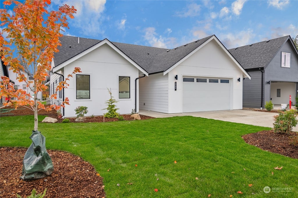 Discover single-level living at its finest in The Ridge! This beautiful 3-bedroom, 2-bathroom home offers a spacious, step-free layout that blends comfort and convenience. The expansive open-concept living space features tall ceilings and a cozy propane fireplace, creating a warm ambiance perfect for any season. Outside, the covered back patio invites you to relax and enjoy the outdoors, rain or shine. High-quality details abound, from luxury vinyl plank flooring and quartz countertops to the durable, low-maintenance slab-on-grade foundation. This home is close to downtown Blaine and I-5. *LIMITED-TIME SAVINGS up to $5K with Seller & .75% Lender Credits.