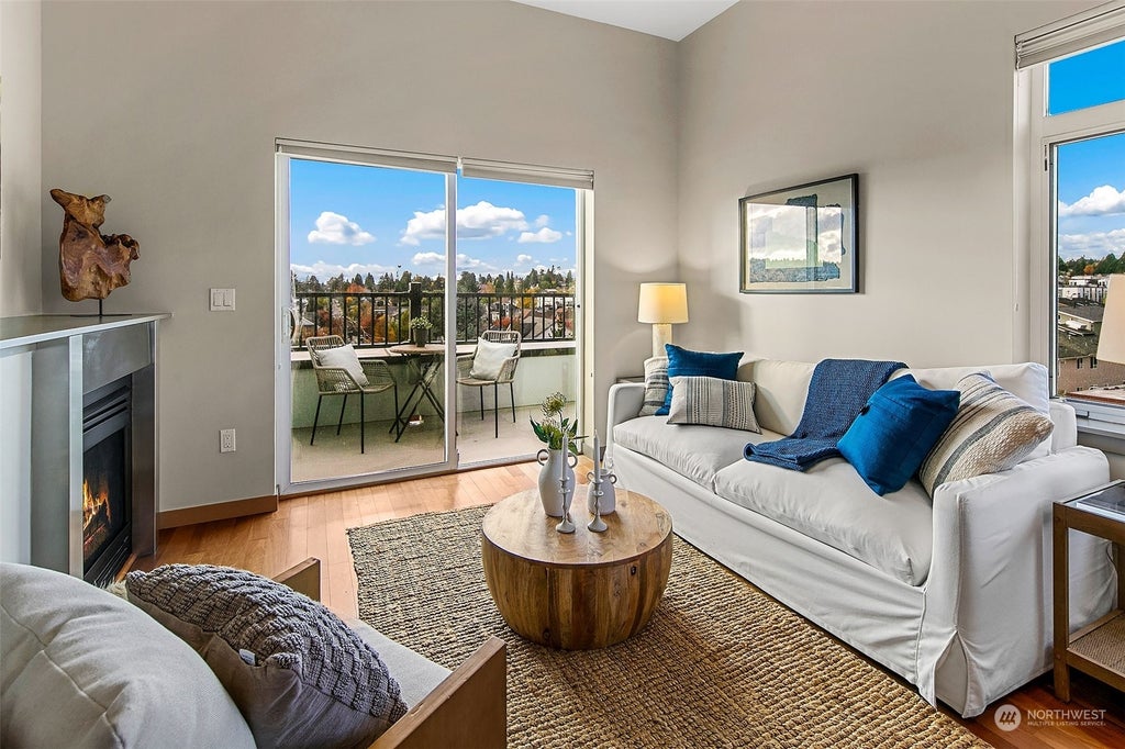 10’ High ceilings capture the light in this top floor NW corner condo in the heart of Ballard. Beautiful views of the Olympics are on display from large corner windows in this spacious 2 bedroom. Cherry hardwood floors and a dual sided gas fireplace add warmth to the open living layout featuring a bright kitchen with gas cooktop. Open air balcony offers the perfect perch to take in the views with fresh air enjoyment. Primary suite fit for a king with fireplace and walk-in closet. 2nd bedroom is well positioned, large, but non-conforming. Lots of closets, including a pantry and full size w/d. Garage parking and additional storage included. Ideal Ballard location with QFC, Sunday Market, favorite eateries, parks and every amenity nearby.