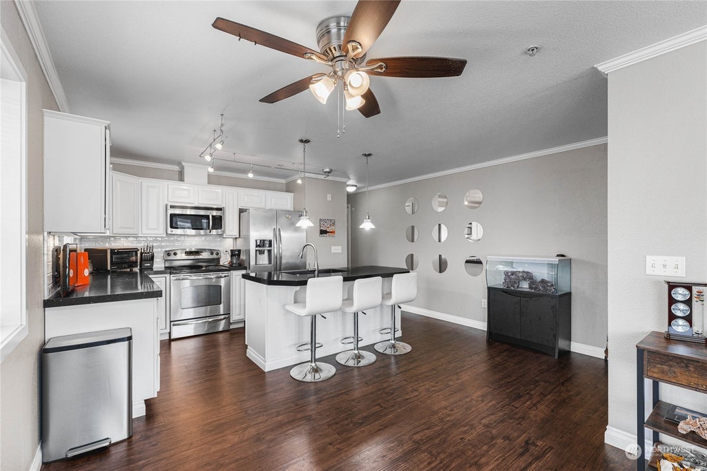 Don’t miss out on this stunning top-floor 2-bed, 2-bath corner condo in the highly sought-after gated Trio Residences! Meticulously remodeled, this home offers a bright, open floor plan with gorgeous laminate wood floors and tons of natural light. Functional living spaces with updated kitchen, crown molding, bar seating at the island and more. The spacious primary bedroom offers a private en suite bath for added convenience and comfort. Enjoy the views from the balcony and don't miss the added benefits of a tandem garage with an upgraded storage system! All appliances are included! Resort-style amenities including a pool, hot tub, gym, playground, clubhouse and pet friendly. Close to all amenities, highways & JBLM.