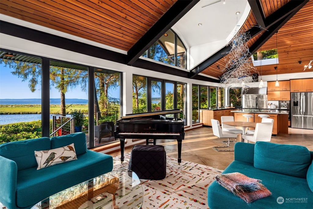 Architectural gem perched on 121' of no-bank waterfront on a natural lagoon with expansive views of Saratoga Passage. This custom 2-bedroom and den home with artist studio features modern design with concrete, wood, and steel, vaulted ceilings, and a wall of windows. High-performance SIP construction, energy-efficient windows, Stûv wood stove and geo-thermal radiant heating provide comfort year-round. The chef's kitchen boasts granite and stainless countertops, fir cabinetry, and high-end appliances. Enjoy outdoor living with easy access to paddleboarding, kayaking, AND deep-water access from the private community beach. A perfect celebration of design and nature.