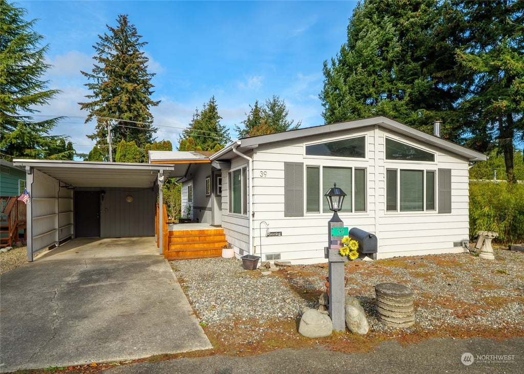 Charming double-wide home in the Green Acres Mobile Estates, a 55+ community. Enjoy cozy evenings by the freestanding woodfire stove and soak in the natural light streaming through large living room windows with partial Olympic Mountain views. Just 5 minutes from downtown Sequim for shopping, dining, and medical facilities, with easy highway access to the Olympic Peninsula's outdoor activities. Park rent covers water and sewer. Community amenities include gardening space with fruit trees and RV parking. Experience the perfect blend of convenience and tranquility!