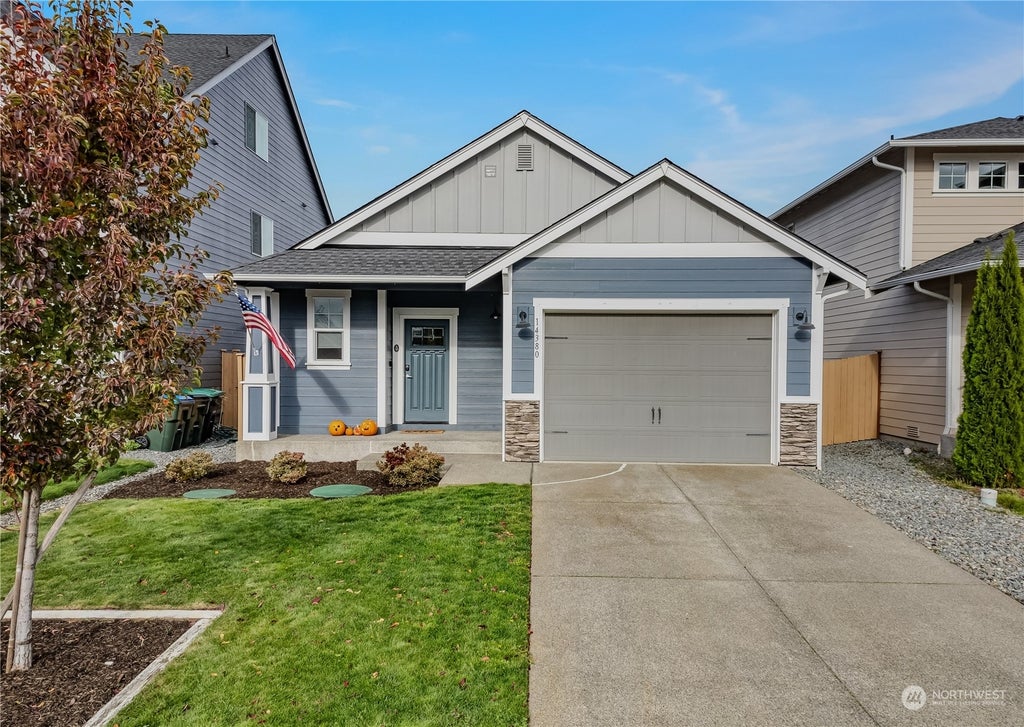 Charming 3-bed, 2-bath home nestled in Yelm's serene Tahoma Terra community. This home features a large open-concept living space with abundant natural light and a cozy fireplace. The kitchen features modern appliances, ample staggered cabinetry, quartz countertops, tile backsplash, and a spacious dining area. The sizeable primary bedroom offers en-suite bathroom with double sinks. Outside enjoy the fully-fenced backyard, perfect for entertaining and play. Conveniently located near schools, parks shopping, restaurants and JBLM. This home combines comfort and convenience for peaceful living. Don't miss this move-in ready gem.