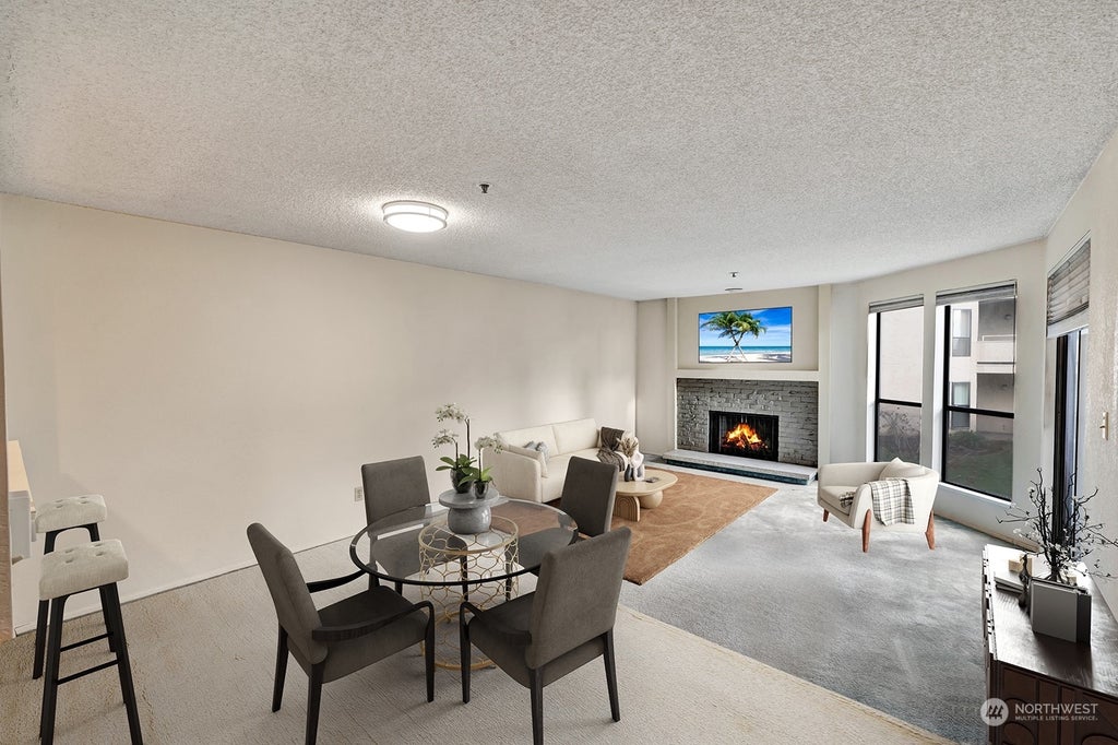 Hot New Price! Spacious 2Br/1.75Bth condo in an ideal Southcenter location! Bright, open-floor plan with cozy fireplace overlooking greenbelt from the covered deck (storage unit too), & full-size side by side W/D. Kitchen w/eating bar opens to living room! Spacious primary suite w/ensuite full bathroom & double closets. Level-entry & elevator access in community getting exciting new updates soon. Enjoy community amenities: fitness center, tennis courts, sauna, and a newly renovated pool. Includes 1 assigned carport prkg space. 2 pets under 25#. Close to plentiful shopping & dining options at Westfield Mall. Easy I-5, I-405, Hwy 167, airport, light rail, & transit options–you'll love the convenience! Don’t miss this incredible opportunity!