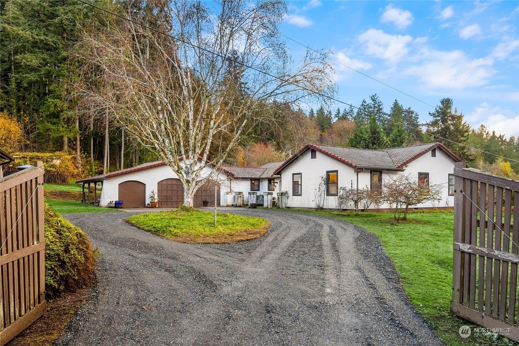 Nestled in the heart of Bainbridge Island, this single-level Mediterranean-style stucco home on 4.1 acres offers a combination of charm, tranquility, and convenience. Set on a lush, picturesque lot with several small outbuildings, those dreaming of a hobby farm will have plenty of room to be creative! Step inside to discover a thoughtfully crafted interior featuring warm hardwood floors, and a large kitchen with Quartzite counters. The arched entryways create a sense of flow and openness. The primary suite is a true sanctuary, complete with a spa-like ensuite and a generous walk-in closet. Two additional bedrooms are spacious and versatile. A detached guest casita offers ultimate privacy and charm—ideal for visiting family or a home office.