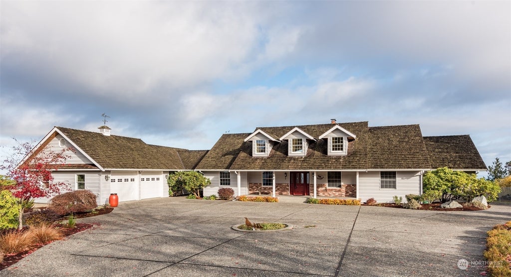 As one of the first homes built on Bell Hill, this almost level 1.5 acre lot was chosen for its spectacular and unobstructed panoramic saltwater views from Port Angeles to Mt. Baker. A soaring wall of windows capture views of the lighthouse, Victoria and the San Juan Islands. Well built 3 bdrm home plus office/den, formal dining and rec room are all on the main level. Large loft with custom built-in cabinets and bathroom on upper level. This home has hardwood floors, a gas fireplace & wood stove, a spacious primary suite and 1070SF of decking for indoor/outdoor living. Private setting includes a 40'x24' RV garage tucked discreetly into the park-like landscaping, small pond and partially fenced yard for pets.
