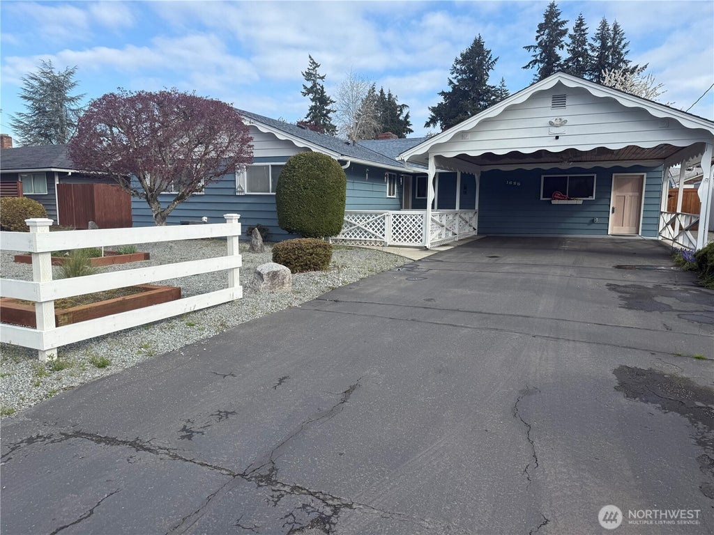 Cozy, fully remodeled rambler with new roof, gutters, exterior paint, and easy-care landscaping featuring a plum tree. Inside boasts new interior paint, laminate flooring, carpet, updated kitchen with stainless steel appliances, modern light fixtures, and updated wiring. Features a wood-burning fireplace, formal living and family rooms, and split heating in every room. Stunning bathroom with large walk-in tile shower and sit-down makeup vanity. Large pantry and two spacious sheds for storage. Covered patio perfect for entertaining. Potential for a mother-in-law suite with its own entry. Conveniently located near McChord, Fort Lewis, and freeway access—this move-in-ready home has it all!