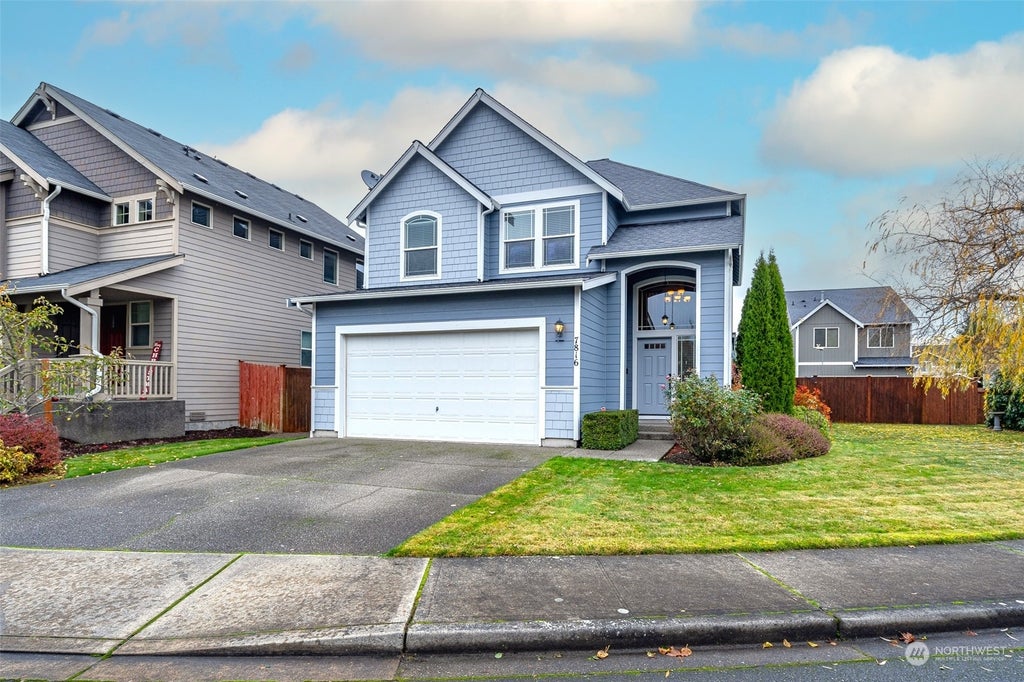 The Model Home of the neighborhood is for sale! The main level boasts an open-concept kitchen and living room, complete with stainless steel appliances and a quartz-surround gas fireplace. The den/office is enhanced with luxury vinyl plank flooring, a stunning coffered ceiling, and french door entry. Upstairs, the large primary suite impresses with a luxurious 5-piece bath, while two generously sized guest rooms share a full bath. A convenient half bath is located on the main floor. Outdoor living shines with a backyard paver patio, fully fenced for privacy, and a built-in sprinkler system for effortless lawn care. Enjoy year-round comfort with a new furnace and heat pump. All the extras including a charging port in the finished garage.