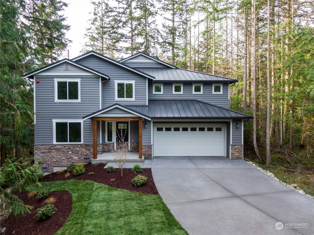 Brand new home on a beautiful forested 4.24 acre lot. 3 Car Tandem garage. Neighborhood is gated with an unattended guard house for added security and privacy. Trails lead to Whistle Lake. Metal roof and cedar siding. The home is completed with white painted cabinets, LVP and tile floors, slab granite counters, full height backsplash, white painted millwork, wood wrapped windows, double panel white painted doors and stainless steel KitchenAid appliances. High ceilings in the huge family room, formal dining room, downstairs office and a huge master bedroom make this home extremely functional. Hybrid heat pump water heater, High Efficiency ductless mini splits provide both heating and air conditioning to the entire living space.
