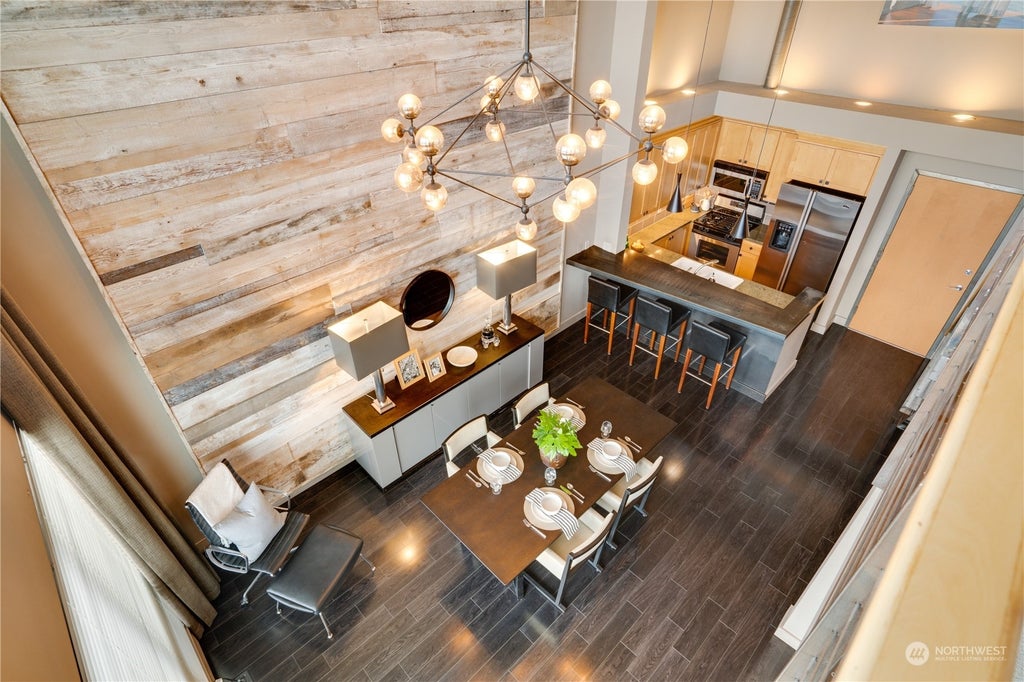 Welcome to coolest unit in this building with a killer view! Loft style with floor to ceiling windows and fabulous deck space. The paint colors, wall treatments and wood wall make this unit standout. Open concept bedroom looks out to the city and Mount Rainier as well as the living space. Comes with two parking spaces in secure garage. Walking distance to restaurants, shopping and the waterfront. Building has great workout room and community space. This condo is perfect for someone with a great sense of style.