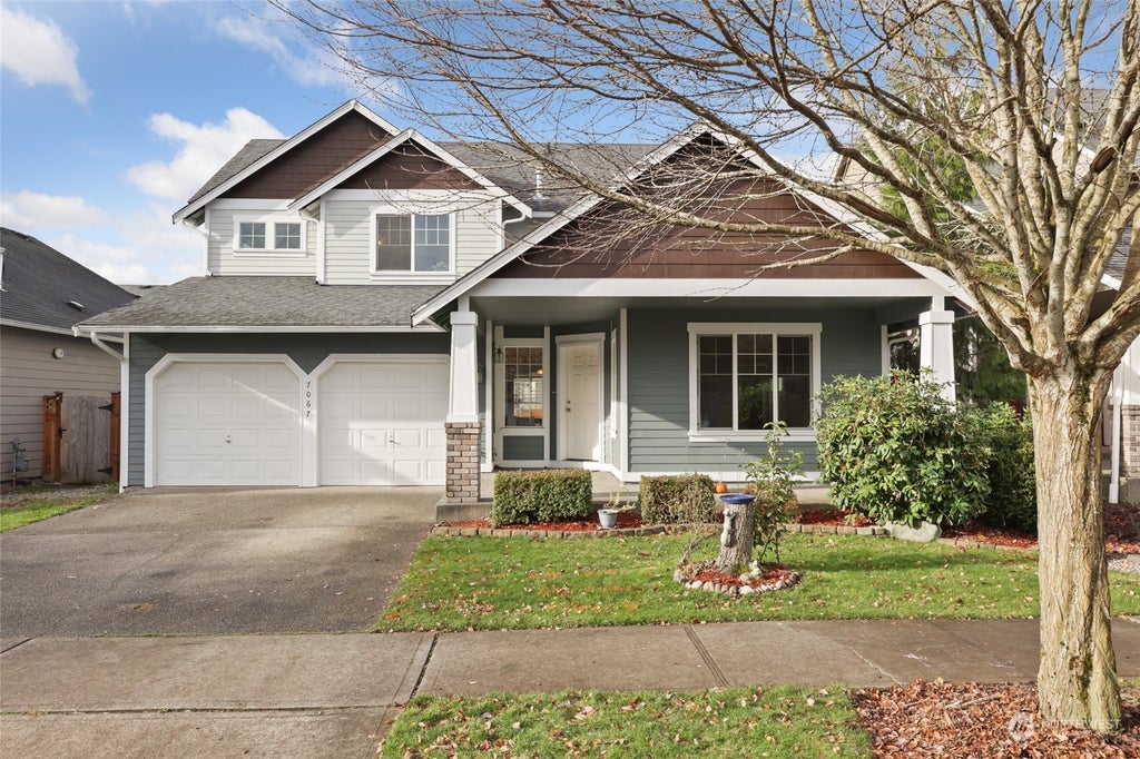 Horizon Pointe Home! Wonderful 2,200+ sq. ft. home offers a functional floorplan with living & dining room, kitchen with eating area, pantry space, built-in desk nook, family room with cozy gas fireplace, laundry, storage closet & a half bath all on the main floor. Upstairs, the spacious primary bedroom features a walk-in closet & 5-piece ensuite, 3 additional bedrooms, a hallway linen closet & full bathroom complete this level. Brand new carpeting. Updated furnace & solar panels provide improved energy usage & savings. Covered back patio, low maintenance fenced yard & raised garden beds make this a comfortable backyard. Great access to I-5, JBLM, restaurants, shopping & activities.