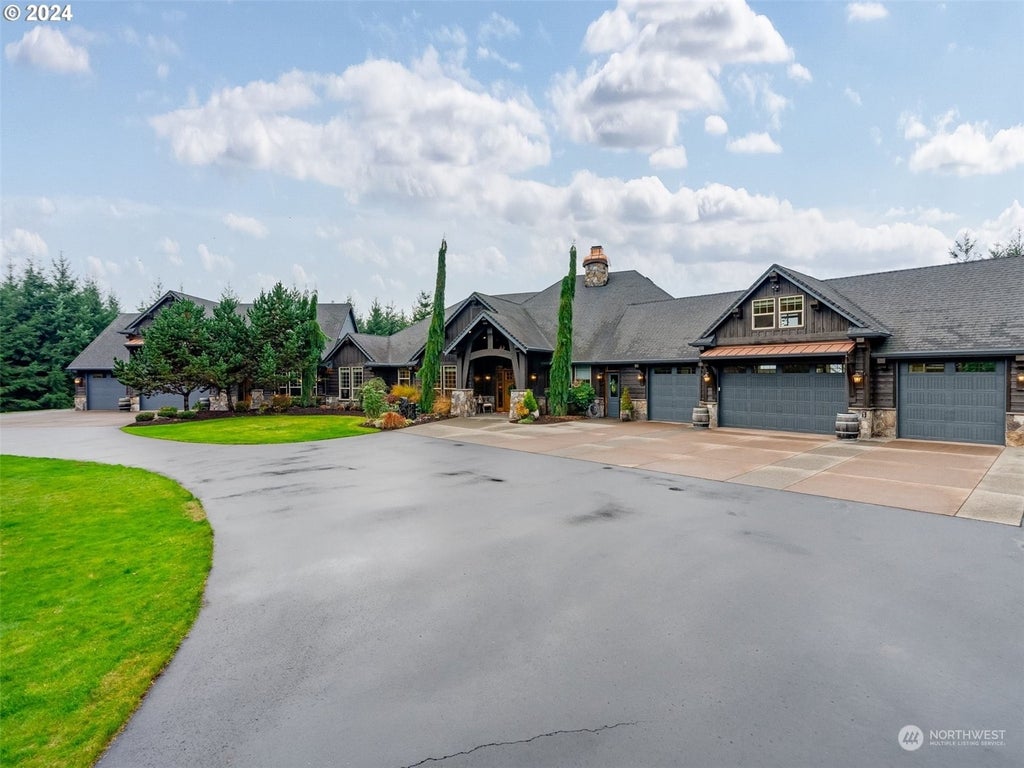This exceptional custom timber-framed home sits on 20 acres and offers a unique blend of luxury, craftsmanship, and functionality. Featuring open, curved beams, the home showcases authentic artisan details. It offers durable, high-end finishes throughout, with slab granite surfaces and expansive tongue-and-groove cedar ceilings. Designed with versatile living spaces, partnered with custom-built storage solutions and French doors that open to patios with stunning NW views. The 2nd residence has so many options, with vaulted ceilings, built-ins, wood stove insert, walk-in closet, and full bathroom. Guest suite above the 4 car garage with a private entrance. Barn with 3 stalls and tack room/workshop. One-of-a-kind true gem of a property.