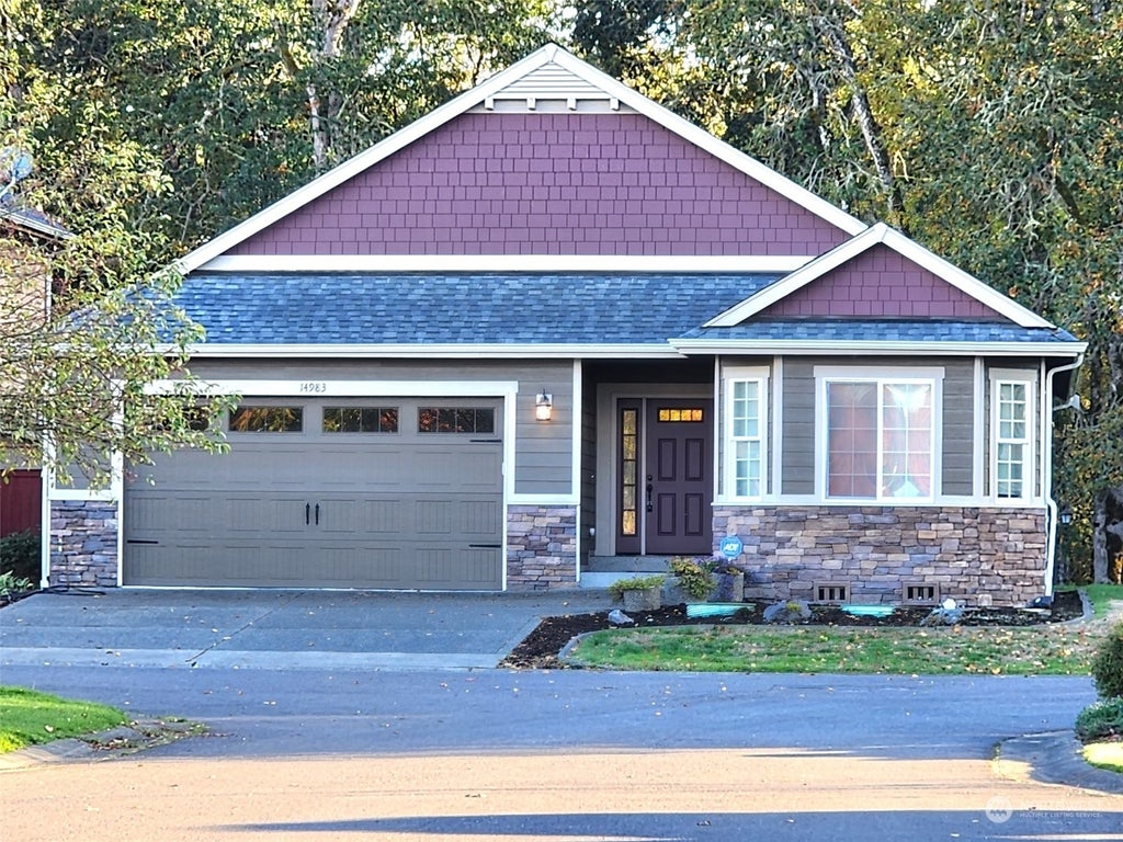 Beautiful rambler ! Vaulted great room with central gas fireplace. Eat in kitchen with granite, tile backsplash and stainless appliances. Rich cherry cabinets and engineered hardwood floors. Pretty architectural features - art niches, arches in the hallways, open shelving at the ceiling with indirect lighting in the main living area. Large primary with walk in closet. Retractable awning over patio and a lush yard with view of Tahoma Valley Golf and course and open space. Garden shed included. Not a cookie cutter spec home. Lovely home with attention to all the right details!