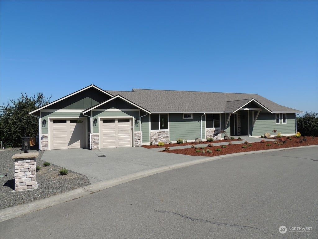 New home in Sequim's Cedarbrook Estates with owner financing. 3 BR, 2 BA on one level. Nice views of territory, water and Mt Baker. Energy features include heat pump, programmable thermostat, hybrid heat pump water heater, hot water circulation pump, supplemental heat in bathrooms. LVP floors throughout, quartz counters, custom white cabinets with under cabinet lighting. Primary suite: tile shower with seat, detachable shower head & frameless glass door, double sink vanity, spacious walk-in closet, separate toilet room. Laundry room cabinets and sink. Walk in pantry with shelving. Roomy den with double glass doors. 8 foot exterior doors, 9 foot ceilings and tall windows for abundant natural light.