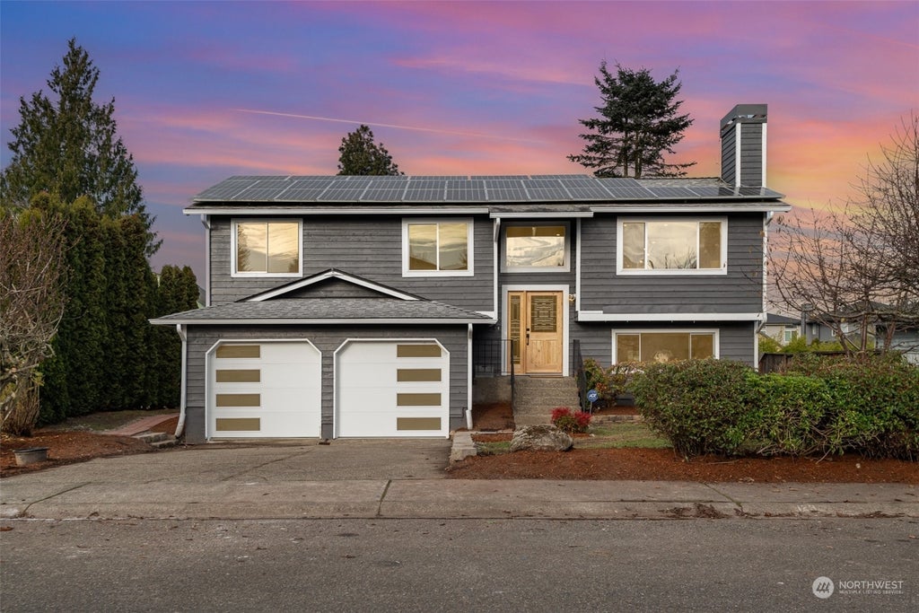 Stunning 4-BDRM remodel, Modern design & well-appointed finishes throughout. Highly-sought Des Moines neighborhood in quiet cul-de-sac. Soaring vaulted ceilings greet you. Main floor w/open floor plan, large kitchen island, quartz countertops, new cabinetry & stainless steel apps. Kitchen opens to great room, dining nook, large living spaces & entertainment sized composite-deck. Primary BDRM includes 3/4 bath w/tile surround & double closets. New interior & exterior paint, new matte black fixtures throughout, new doors, mill-work & luxury plank flooring. Lower level includes 1-BDRM & 1/2 bath, laundry W/D + large rec/flex room. New French doors open to backyard. Whole-house solar system for year-round energy savings! Heat Pump & Central A/C