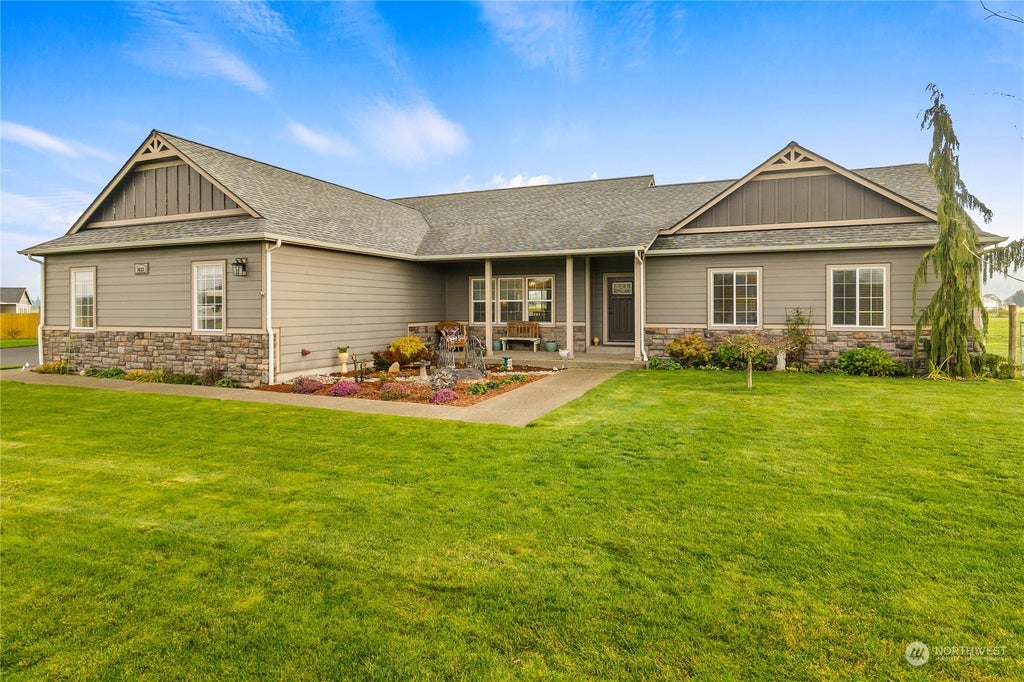Beautiful custom home, quality construction & meticulously maintained. Situated on 5 acres with sweeping views of farmland & distant hills. Gardens & fruit trees already setup & room for livestock/chickens. Lovely cedar barn/shed ideal for garden/feed or small livestock. Home has 4 potential beds (3 plus office) with a 4 bdrm septic. Stainless steel appliances & granite kitchen in the center of house surrounded by cozy family room/den, living & dining room. Primary suite has cathedral ceiling, patio access, set apart from other bedrooms, large 5-piece bathroom & walk-in-closet. Irrigation system keeps professional landscape green year-round. Huge 3 car garage & 40x27 RV garage/shop w/ 14+ ft roll up doors, plus outdoor RV hookup.