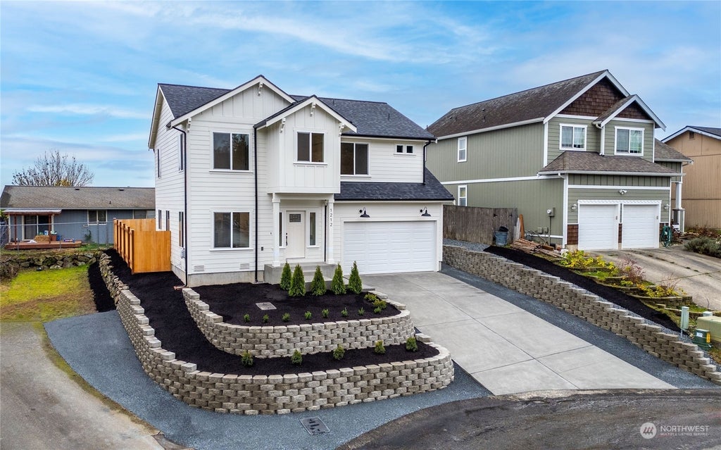 Capture views on this new construction home nestled in a quiet cul-de-sac. Thoughtfully designed, it features an open-concept layout with 9-foot ceilings on the main floor, 4 spacious bedrooms, and 2.5 baths. Enjoy water-resistant luxury vinyl flooring and upgraded carpeting. The modern electric fireplace adds warmth, while upgraded LED light and plumbing fixtures enhance the contemporary look. The kitchen showcases exquisite quartz countertops, a beautiful backsplash, stainless steel appliances, and large island. The primary bedroom offers breathtaking views of Mt. Rainier, a large walk-in shower, and a soaking tub. Air conditioning for hot summers. Beautifully landscaped and fully fenced, it's just 5 minutes from the freeway with no HOA!