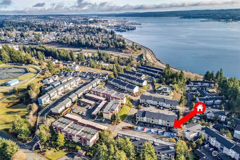 This light filled 2-bedroom condo offers stunning water views. Enjoy your morning coffee beside the wood burning fireplace or take in the PNW air on the balcony & enjoy the views of the water & Mt. Rainier. 2 spacious bedrooms, including the Primary with convenient en-suite bathroom & tons of storage. Washer and dryer hookups in the unit! For your peace of mind, low HOA dues include water, sewer, trash and building maintenance. Community tennis courts, pool, clubhouse, gym, dog park & extra parking! Amazing opportunity to invest in yourself & own your own home. Located just a few minutes from Downtown Bremerton, you'll be close to Shipyard, Ferry, Sinclair Park, and Forest Ridge Park—perfect for exploring. **3k flooring allowance**