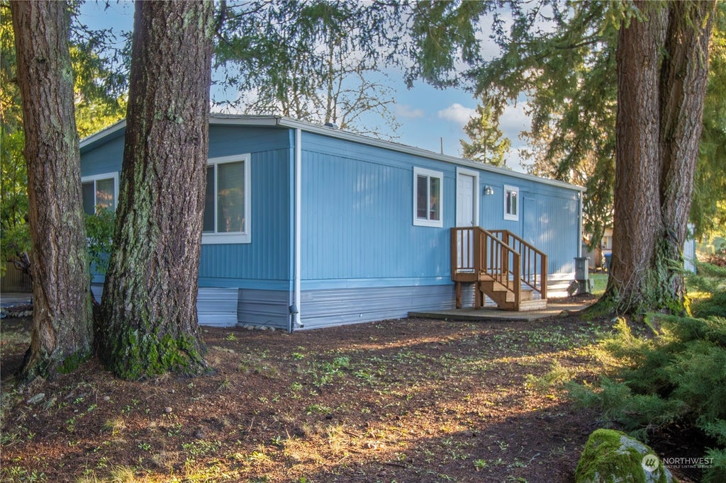 Newly remodeled 3 bedroom, 1.75 bathroom home in all-ages Wooded Village. Large lot and tall trees backed up to greenbelt create a feeling of privacy. New doors, windows, blinds and flooring throughout. Entirely new kitchen and bathrooms with new fixtures, cabinetry and counters. Primary bedroom with walk-in closet and bathroom attached. New furnace, water heater and TPO roof. Covered deck and carport with storage/workshop and 2 parking spaces. Nearby Lacey shopping, restaurants, and amenities.