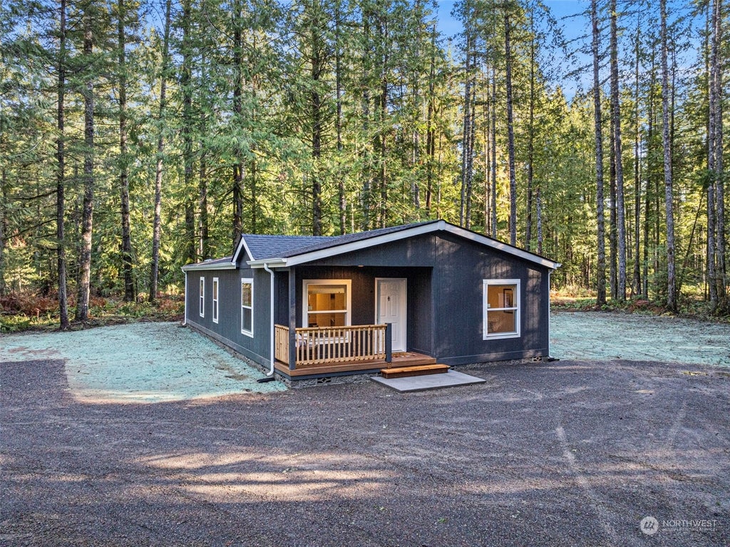 This brand-new energy-efficient Fleetwood Manufactured home features 1,333 sq ft w/ 3bed and 2 bath. The oversized primary bedroom includes a luxurious ensuite bath for ultimate comfort. The home boasts a modern kitchen with a large island, extra tall cabinets with molding, tile backsplash, and cordless window shades. Enjoy two concrete patios, composite decking on the covered porch, and a hydroseeded lawn. Additional features include a new septic system, 15 GPM well, RV-ready power panel, and a 1-year factory warranty. Sitting on .44 acres backing up to 110 county-owned forest, you can ensure privacy and tranquility while being minutes to amenities. Wildcat lake park and heritage trail system just minutes away.