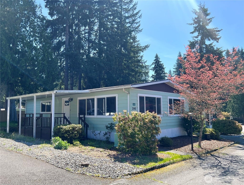 This home has been remodeled with new flooring, doors, bathroom, kitchen and laundry room. Bright 2 bed/1 bath home on beautiful lot in 55+ community Sans Souci. New appliances. Big family room with electric fireplace, big bright new windows. The main bedroom has 2 walk-in closets. Covered 2-car carport with pad for new shed with park approval. The back yard has a fence closed in for privacy. Located in Puyallup South Hill near shopping, freeways and medical facilities. The center has BBQ's, pool tables, shuffleboards, full kitchen, other events. The pool is available during summer. Lease is $1200 and it includes, garbage, comcast cable. Park bills water every other month. Small pet ok. Financed is available.