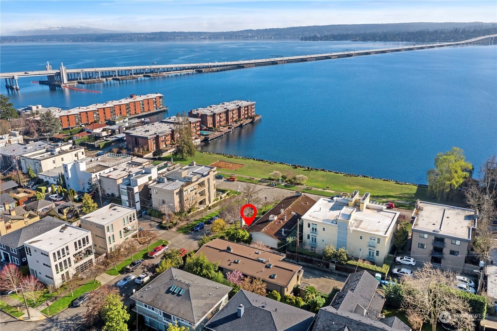 Stunning Midcentury/modern sophistication. This thoughtfully curated & beautifully remodeled top floor condo feels like a house in a boutique 2 unit building, a stones throw from Lake WA. Private elevator exclusively for this unit, directly from the garage. Vaulted ceilings & walls of windows invite the picturesque surroundings indoors. Entertain effortlessly in the spacious, well-designed living areas, w/ seamless flow from room-to-room. Gorgeous primary suite addition, featuring a large soaking tub, heated floors & custom finishes. Huge custom closet and sunny deck. Very rare bonus, 3 parking spots, including one garage space. Private fenced yard. Take a short stroll into MP Village, with its shops & restaurants waiting to be explored.