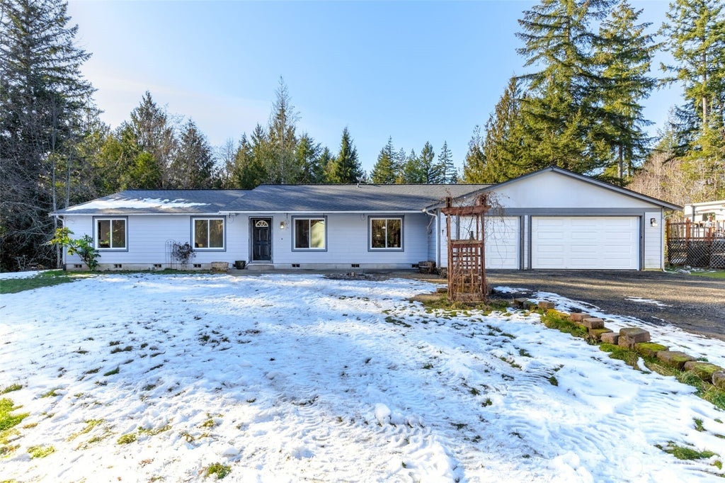 Welcome to this spacious 2,563 Sqft rambler sitting on 5-acres in Belfair. The primary suite and two secondary bedrooms are on one end, while a second primary room sits on the opposite side. Skylights brighten the kitchen, featuring stainless steel appliances and an induction range. French doors open to a covered fully equipped outdoor kitchen w/ice maker & fridge. Recent updates include LVP flooring, interior paint, 50-year roof, & garage doors. Additional features: sprinkler system, 2 garden sheds, greenhouse, chicken coop, storage container & 40X32 durospan metal building (materials on site to enclose), full RV hookups, furnace & heat pump, and a 300ft deep well serving only this property. Plus, a beautiful blue tractor ready to roll!