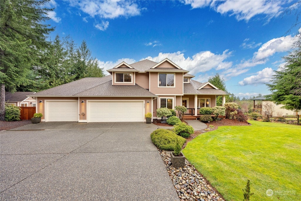 Beautiful picture-perfect Craftsman, where timeless charm meets modern comfort & every detail is designed to inspire. Breathtaking Olympic Mountain views + stunning sunsets as your backdrop, you’ll love entertaining on the expansive deck or simply unwinding at the end of the day. Inside, the main floor boasts formal living & dining rooms filled w/ natural light, a chef’s kitchen featuring granite countertops, a walk-in pantry + a cozy family room anchored by one of two fireplaces. An office & den round out the main level. Upstairs, retreat to the serene primary + 5-piece ensuite walk-in closet, alongside two add bedrooms, a full bath, and laundry. 2.27-acre parklike setting w/ trails. 3-car garage, 3-Shops, garden shed, the list is endless