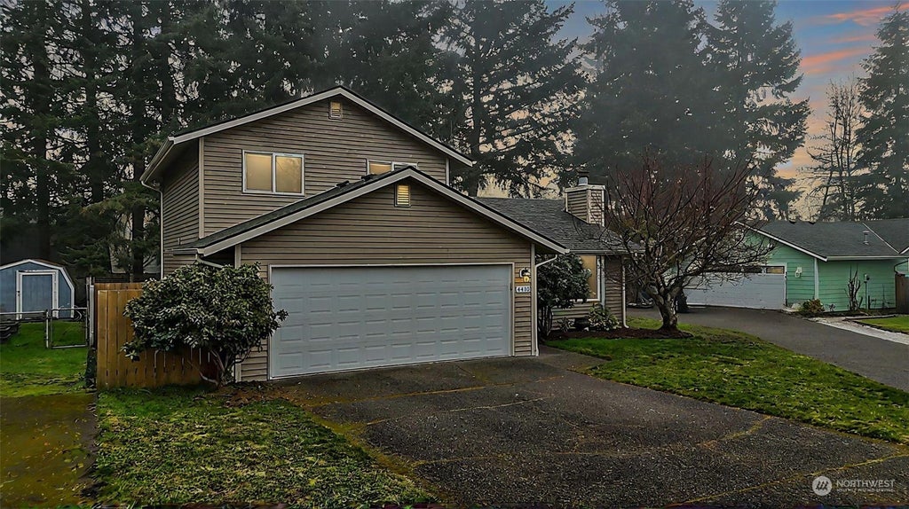 Fabulous 4bdrm find in prime commuting location; just around the corner from parks, shopping, schools, and direct line to I5 access. Move-in ready! Laminate flooring spans throughout the living space boasting vaulted ceilings, gas fireplace, and bay window. Stainless steel appliances stay in Kitchen with granite counters, open to Dining rm. Forced air heat with AC. Situated on the main level, the Primary Suite is finished with His&Hers closets, bthrm w/walk-in shower, and features slider leading out to individual patio w/pergola. Three guest bdrms upstairs. Tall trees provide summer shade to the fully fenced back yard offering raised garden beds & side gate for trailer access. Only 20mins to JBLM. Oh, and did we mention no HOA?