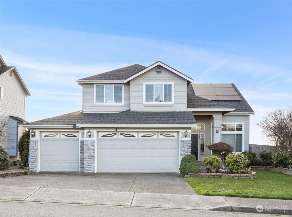 This exceptional 5-bedrm, 3.25-bathrm home offers 3,470 sq ft w/sweeping views of the valley & Olympic Mountains. This expansive 3-story home features a large deck, perfect for outdoor entertaining. Main floor showcases beautiful hardwood floors, a spacious living room, family room, loft area 2 oversized storage closets, & a dedicated theater room w/a projector for the ultimate movie experience. Kitchen boasts granite countertops & stainless steel appliances, ideal for both cooking & entertaining. Recent updates include new solar system, roof, & furnace, ensuring energy efficiency & long-term value. W/a fully fenced yard, air conditioning for comfort year-round, 3-car garage, this home combines luxury w/peaceful living in a serene setting.