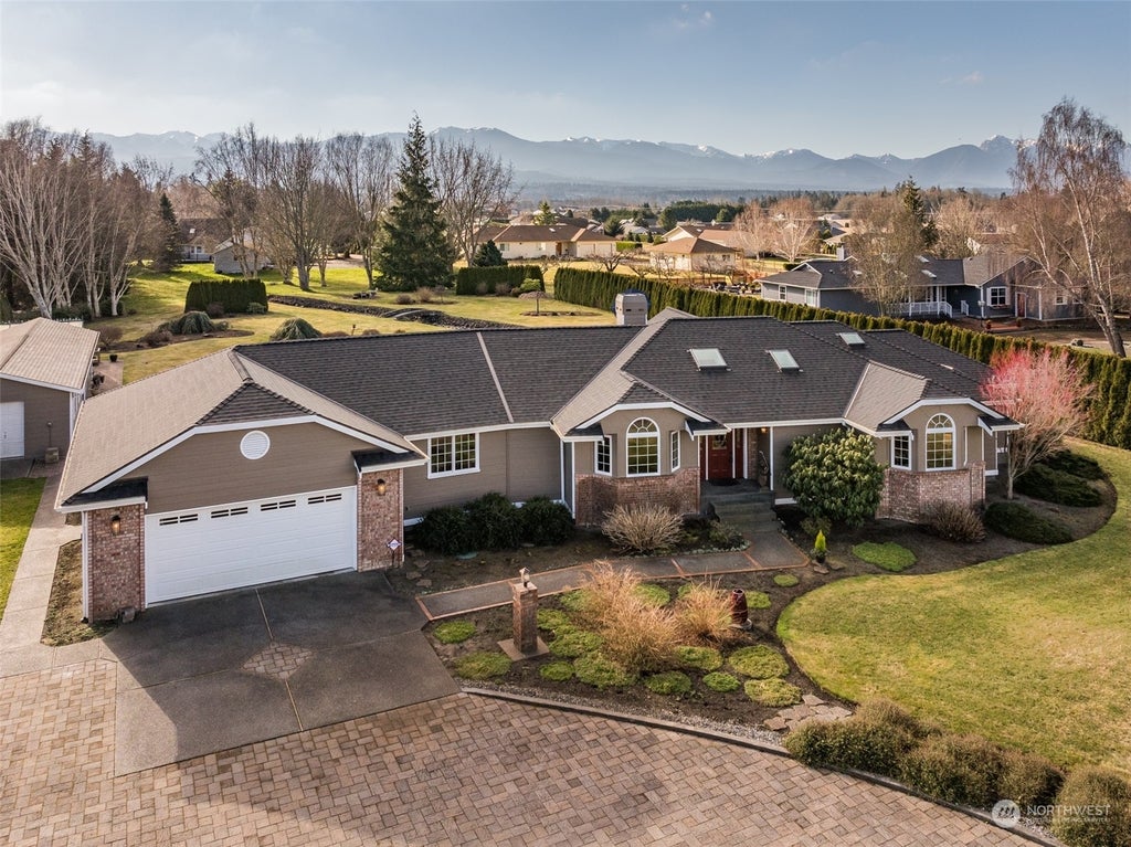 Spectacular mountain view home & private grounds across from the famous Cedars at Dungeness Golf Course. Brick paver driveway & surrounded all sides by an Arborvitae privacy hedge this home has been updated inside & out w/the highest quality materials. Beautiful red oak floors, living room area w/vaulted ceilings, a wall of windows looking out to the mountains and your stunning backyard. 3 sided fireplace, spacious primary BR w/sitting area, slider out to private back deck, large walk in closet. Gorgeous bathroom w/tile floors, soak tub, separate tile shower, 2 pedestal sinks & a stone accent wall. There is another BR with yet another stunning guest bath & a cozy den/office that could easily double as the 3rd BR plus another small office.