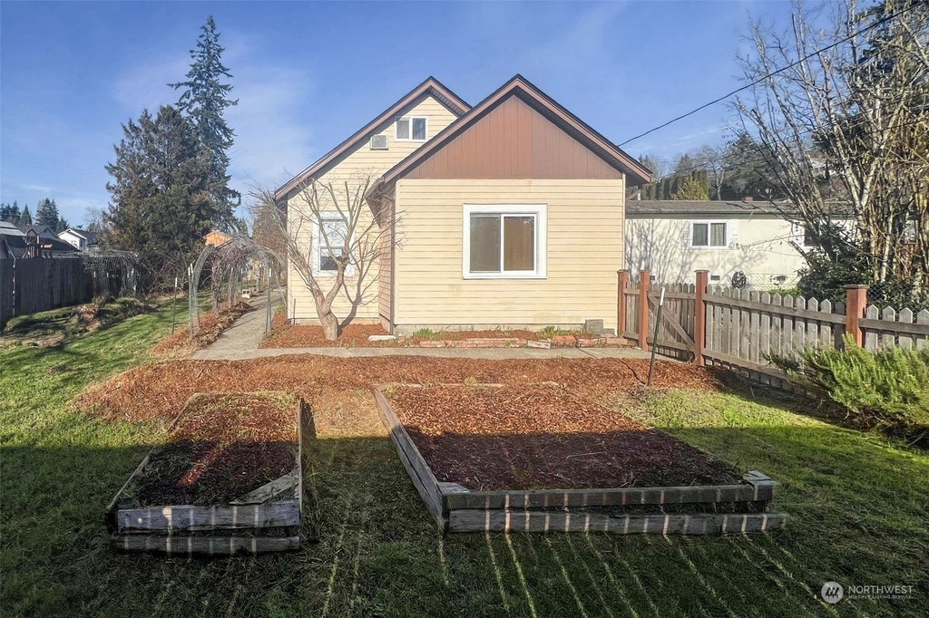 Don’t miss out on this charming 2 bd, 1 bath home full of potential! Living room with woodstove that offers warmth and ambiance, a spacious kitchen with adjacent dining area, and a convenient laundry room. The partially finished attic offers endless possibilities; maybe turn it into a home office, playroom or bonus storage space. The extra-large, level lot has plenty of garden space, a fruit tree and patio area that's perfect for entertaining. Fully fenced yard provides both privacy and a safe spot for pets. Detached garage and long driveway provide ample parking. Centrally located just minutes from the highway, bases, ferry terminal, shopping, and public transportation. This home is ready for you to make it your own!
