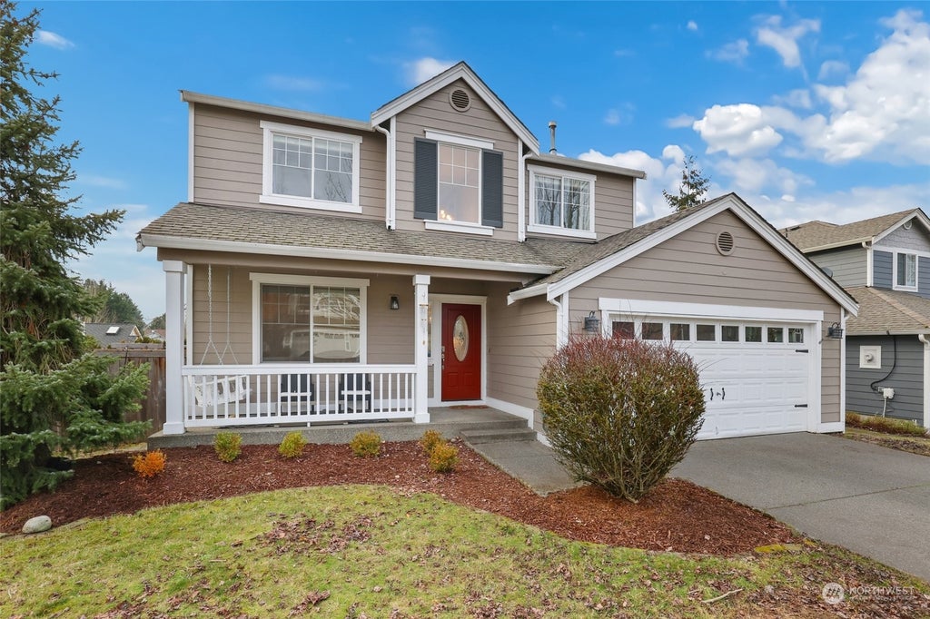 Welcome to this Beautiful, well cared for Lakeland Hills home w/inviting covered front porch & vaulted ceiling upon entry. Boasts an easy flowing floor plan, ample natural light throughout & modern hardwood floors. Sunny family room w/gas FP opens to kitchen w/lovely quartz counters, subway tile backsplash & adjacent dining area. Head upstairs to 3 bedrooms, including the expansive primary suite w/stylish barn door leading to 3/4 en-suite w/large walk-in closet. Outside is your private fully-fenced backyard w/extended patio, raised garden beds & plenty of room for outdoor activities. 2 car garage plus area for shop/storage. AC included! Near parks, trails, Lake Tapps, shopping, dining, commuter routes & all that Lakeland Hills has to offer!