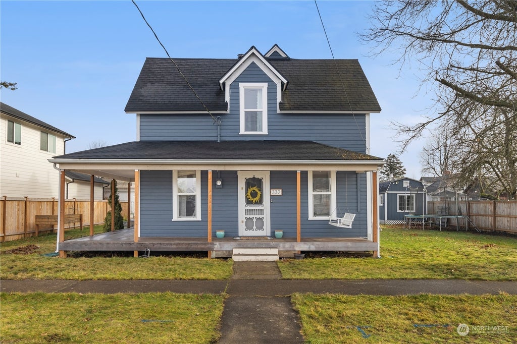Farmhouse style living in downtown Buckley! This truly one-of-a-kind 4 bed + bonus room home features many recent upgrades. The remodeled primary bathroom is a stand out that showcases the original clawfoot tub. The updated eat-in kitchen boasts black SS appliances, a large island, & a cozy wood-burning fireplace. Custom cabinetry in the dining room adds elegance and storage. Further updates include a new foundation (2020), cedar and Trex deck (2020), and an EV charging station. Exterior features include a 2-car detached garage, shed, garden boxes, fire pit, and chicken coop. The property's character shines through with a wraparound front porch, window seats, wood beams & wainscoting, blending history and modern convenience. Don't miss it!