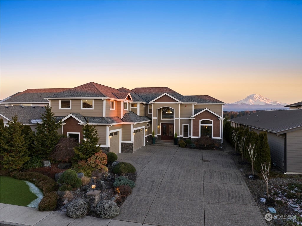 Custom-built luxe home perched where eagles soar! Panoramic Mt Rainier & Cascade views. Nestled in Sky Island's gated community: The Summit. Grand entry w/25ft ceilings & Brazilian cherry hardwoods w/seamless flow. Gourmet kitchen boasts granite counters, oversized island w/seating & luxe appliances. Soaring living rm w/stone-wrapped gas FP & wall of windows frame sweeping East-views. Retreat to main lvl primary suite w/dual-sided FP, custom WIC, spa-inspired bath w/jetted tub & heated marble floors. Wrought-iron staircase leads to bridge walkway to Study. 2nd Primary/Jr suite w/balcony access, add'l bdrms & Bonus/Media rm w/wet bar. Relish in the sunrise in Backyard oasis w/Lg trex deck & tranquil water feature! Finished 3-car garage & A/C