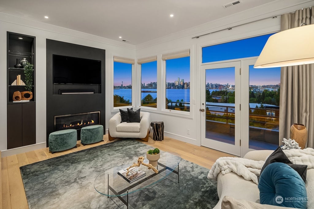 Modern Luxury! Impressive 2855 s.f. (+/-) 2-level Penthouse w/dynamic City & Harbor views! Coveted private garages for 3 cars, + an add’l spot for your guests; so rare @ Alki Beach! A newly renovated residence – with designer accents - is equipped w/remote-controlled skylight, high-end German cabinets, custom shower w/infinity drain, custom & updated flooring, new furnace w/WiFi access & monitored alarm & fire system w/cameras. Thoughtful floorplan w/4 bdrms, 3.5 bths offers guests leisure space on the lower level w/side view deck for BBQ’s. A stunning interior stairway w/steel industrial-style support beautifully connects the upper & lower level. And, the “cherry on the top”, is the nearby Water Taxi & Salty’s on Alki! Aloha from Alki!