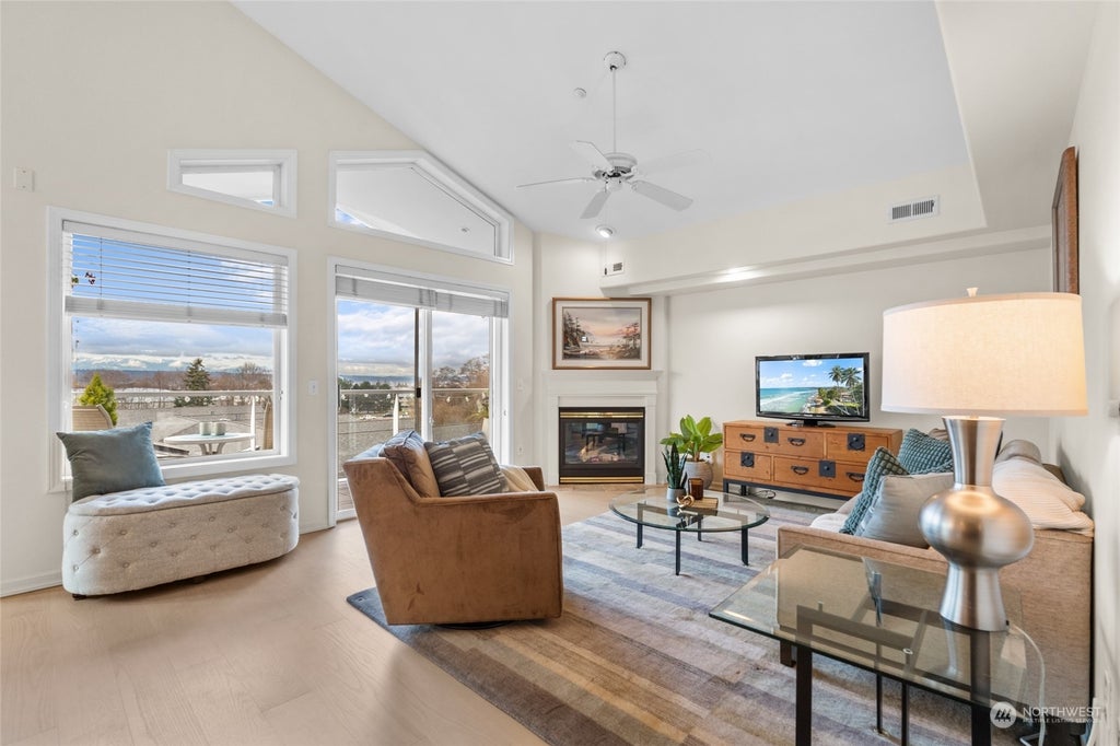 Rare top-floor view condo in Edmonds' beloved Stella's Landing! Sound, ferry and Olympic Mtn vistas from your private balcony and living area. Open, airy living and dining with vaulted ceilings, large windows, fireplace and updated flooring. Wide hall adds to spacious feel. Primary suite feat. dual closets, bright 5-piece bath with jetted tub. Newer SS appliances and granite counters in updated kitchen. Second bed/flex room, in-unit laundry, 2 secure garage spaces, and storage unit. Gather with friends in social room/ exercise area w/sauna. Welcoming small community has ample guest parking, and an elevator right to your door. Steps from City Park, beaches, ferry, pubs, eateries, shops–you'll love the vibrant, walkable Edmonds Bowl life!